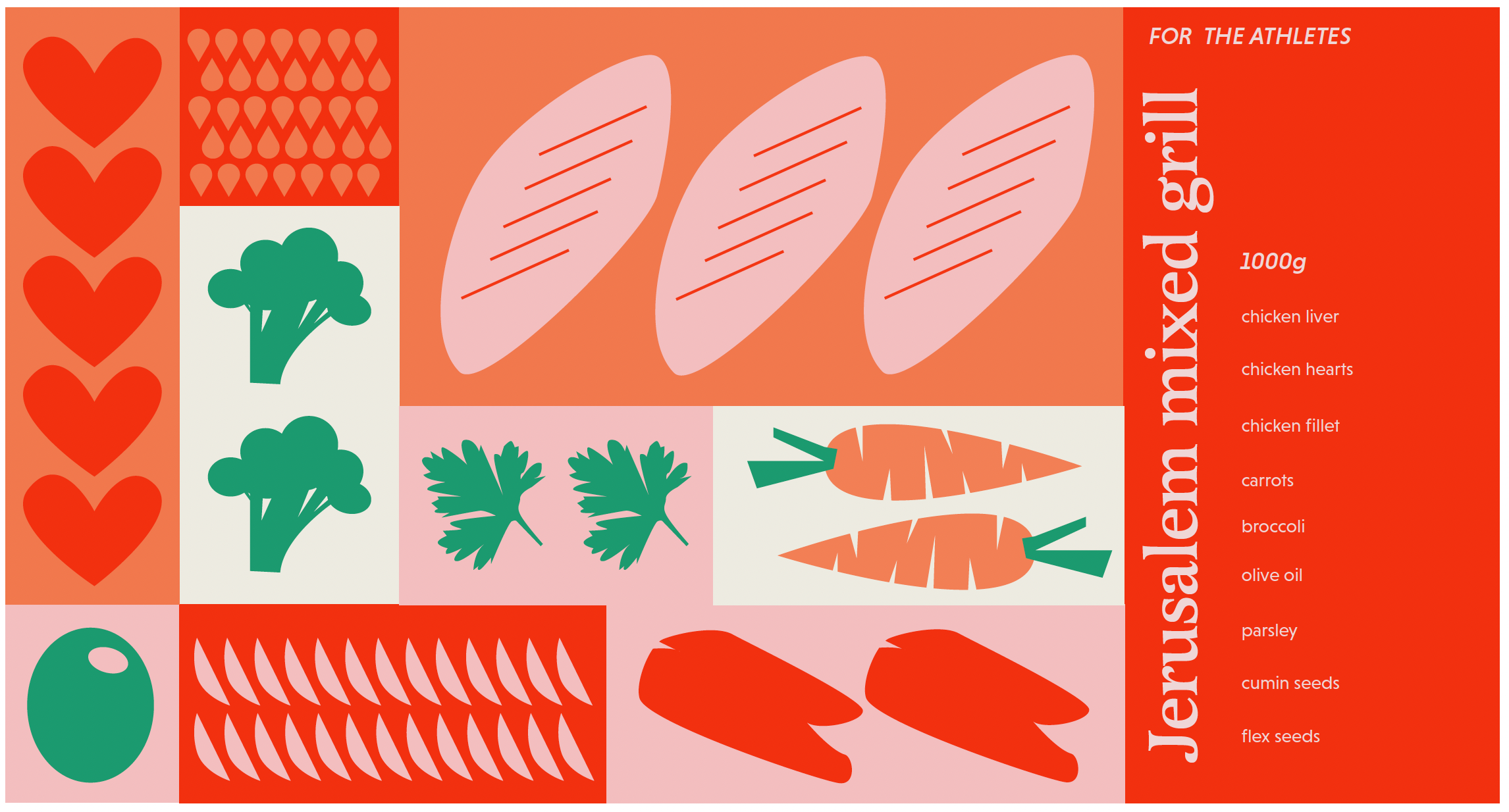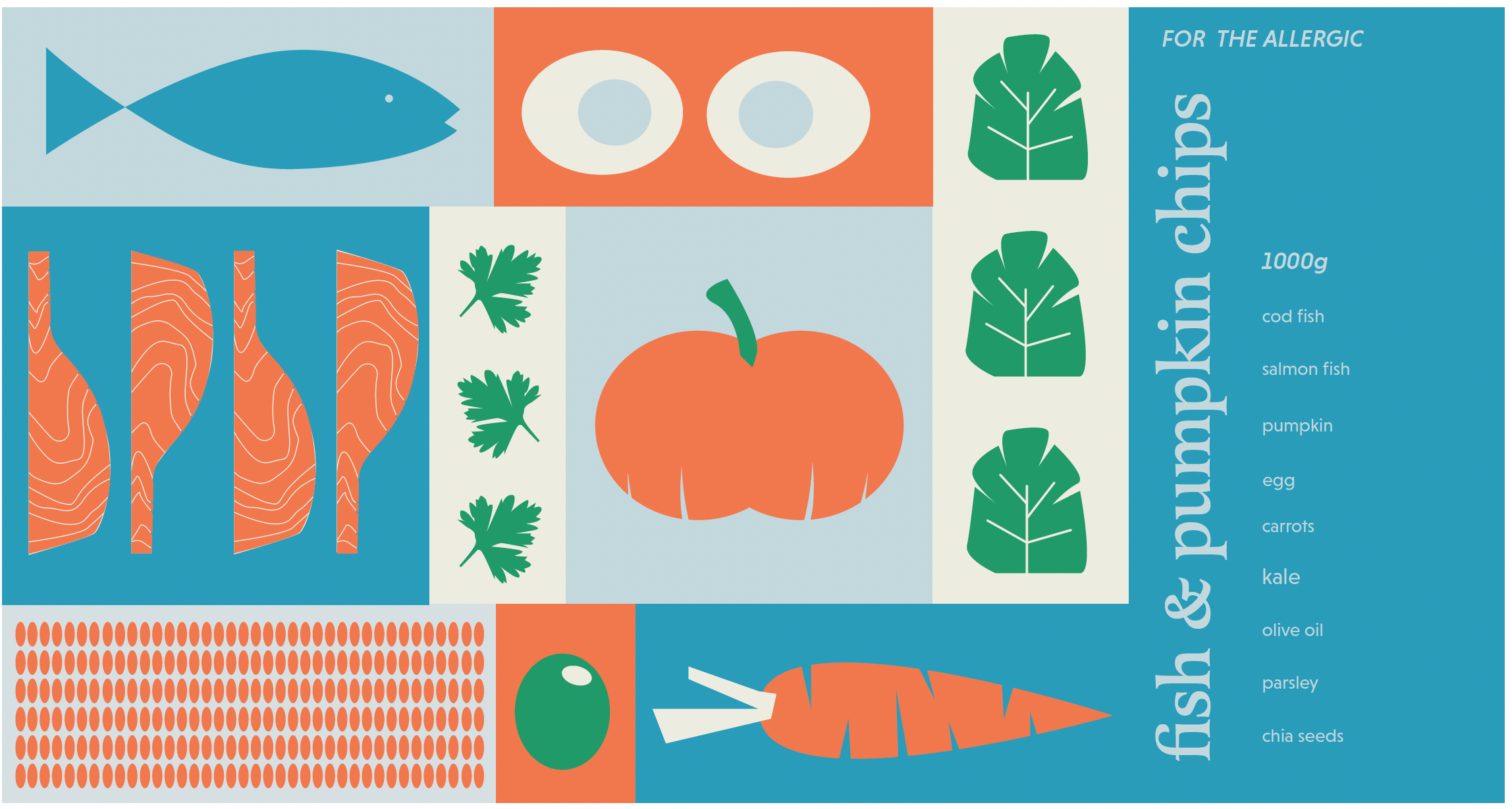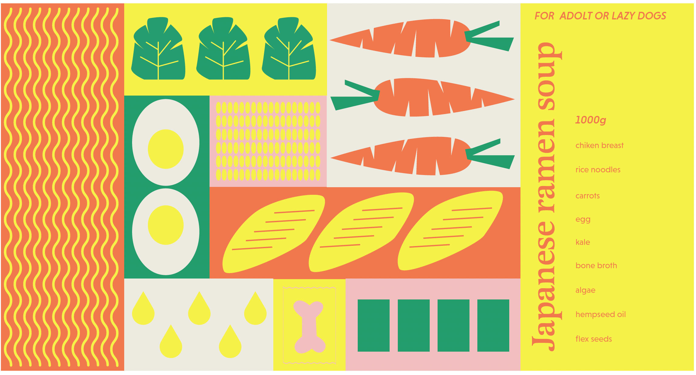 The food itself is taken from our world, familiar classic dishes of humans, to make a comparison between dogs and people. With each package, its ingredients are illustrated. And each dish has its own color palette.